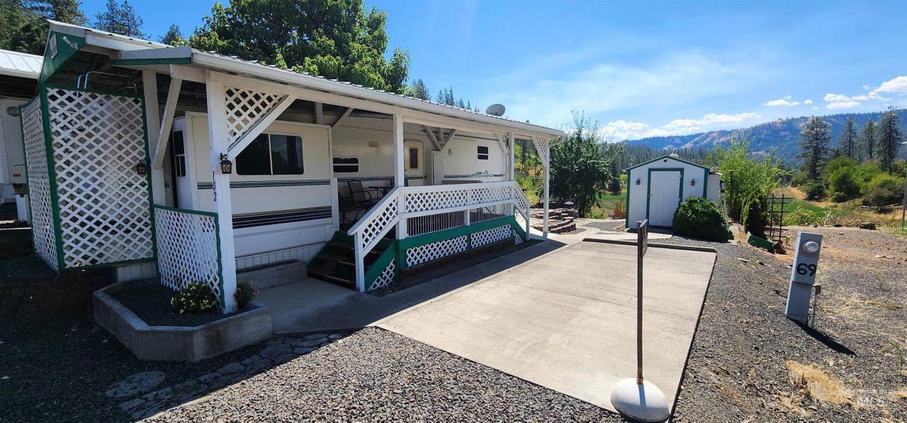 A 40ft 5th wheel in great condition and with updates under a well constructed cover located on a view lot in the 50 plus Lewis and Clark Pines community. A nice covered deck, concrete parking, sidewalks, storage shed, gazebo and other outside landscapping make great use of space and provide multiple places to enjoy the views and wildlife. Located just outside Kamiah and in Idaho County youre minutes away from the Clearwater river and world class fishing. This is one of the best lots when it comes to views and access. A great low cost option to live in the Kamiah Valley. New flooring, Tv and couch in 5th wheel. New paint on shed and Gazebo.